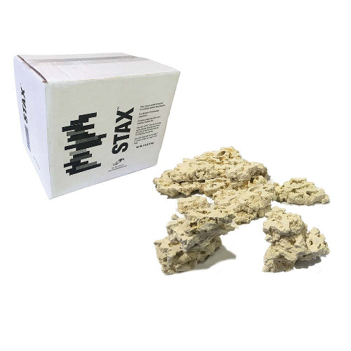 STAX™ is porous natural oolitic limestone rock cut flat on both sides for building layered aquascapes in marine or freshwater aquariums. Provides a stable structure and limitless creative fun! Avoid introducing pests and create the aquascape of your dreams. Use with STIX™ cement to make open, gravity defying structures with lots of horizontal surfaces for attaching live corals. Use AquaStik or CorAffix with STAX to create a base for coral frags. Each box contains an assortment of rock sizes.
